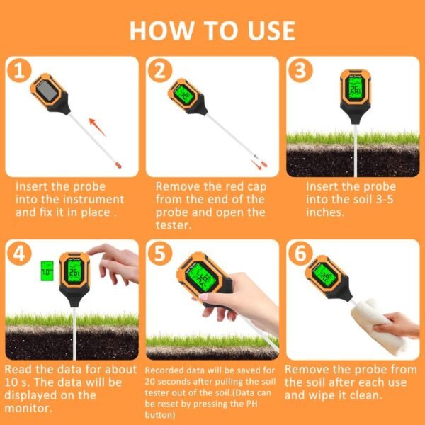• Easy to Use: Insert the probe 3-5 inches into the soil, and get an accurate reading within 10-15 seconds. For best results, water the soil before testing if it is too dry.