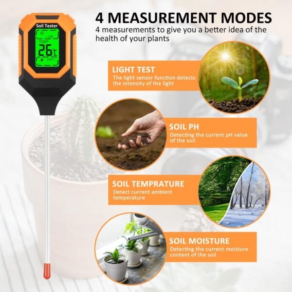 • 4-in-1 Functionality: Accurately measures soil pH, moisture content, temperature, and light intensity to ensure optimal conditions for plant growth.
